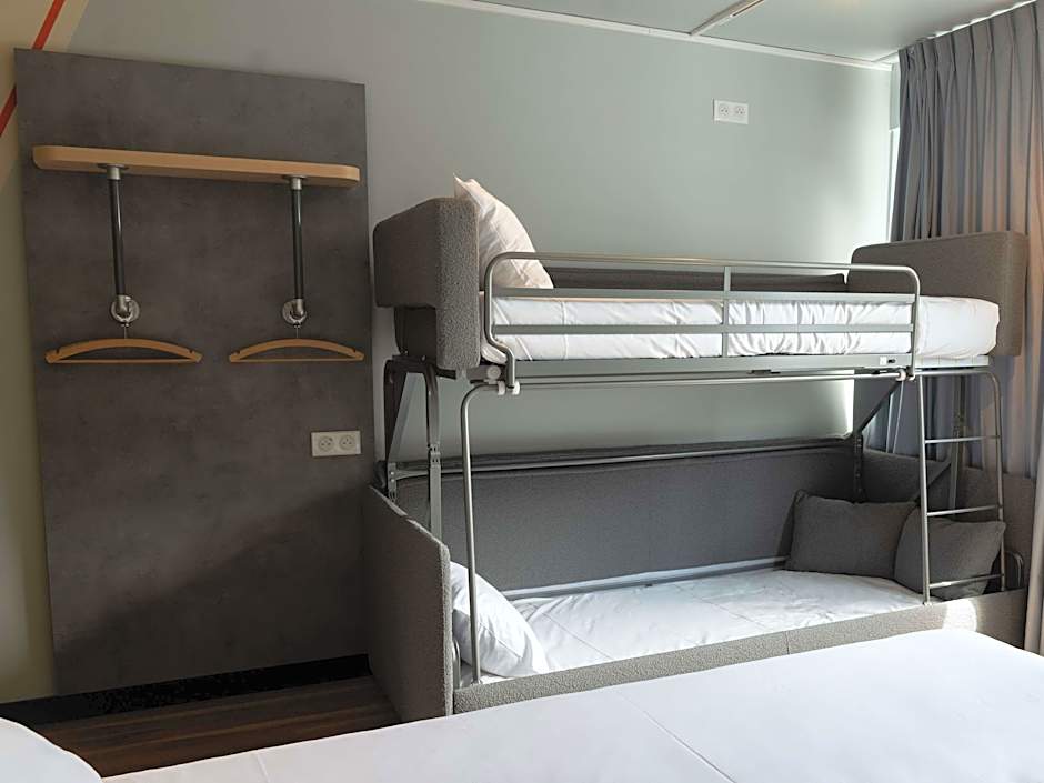 This family room consists of a room with a double bed, a single bunk bed, a bathroom and a separate toilet and a connecting room with a double bed and a shower room.